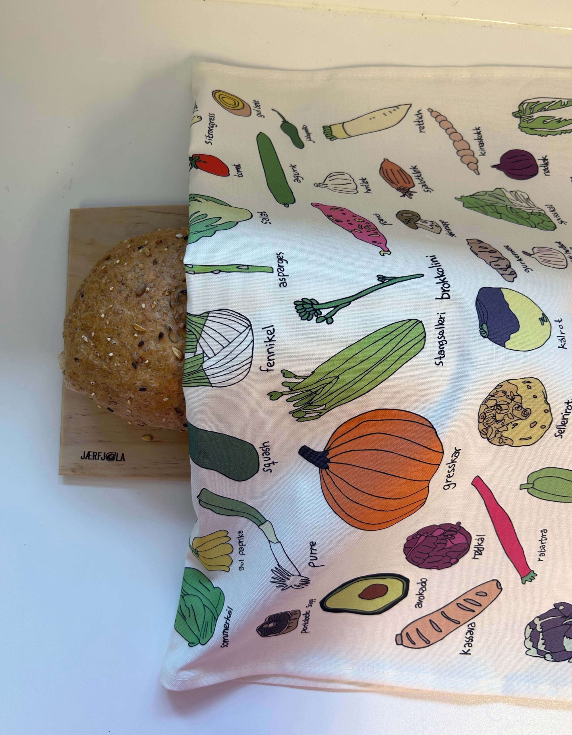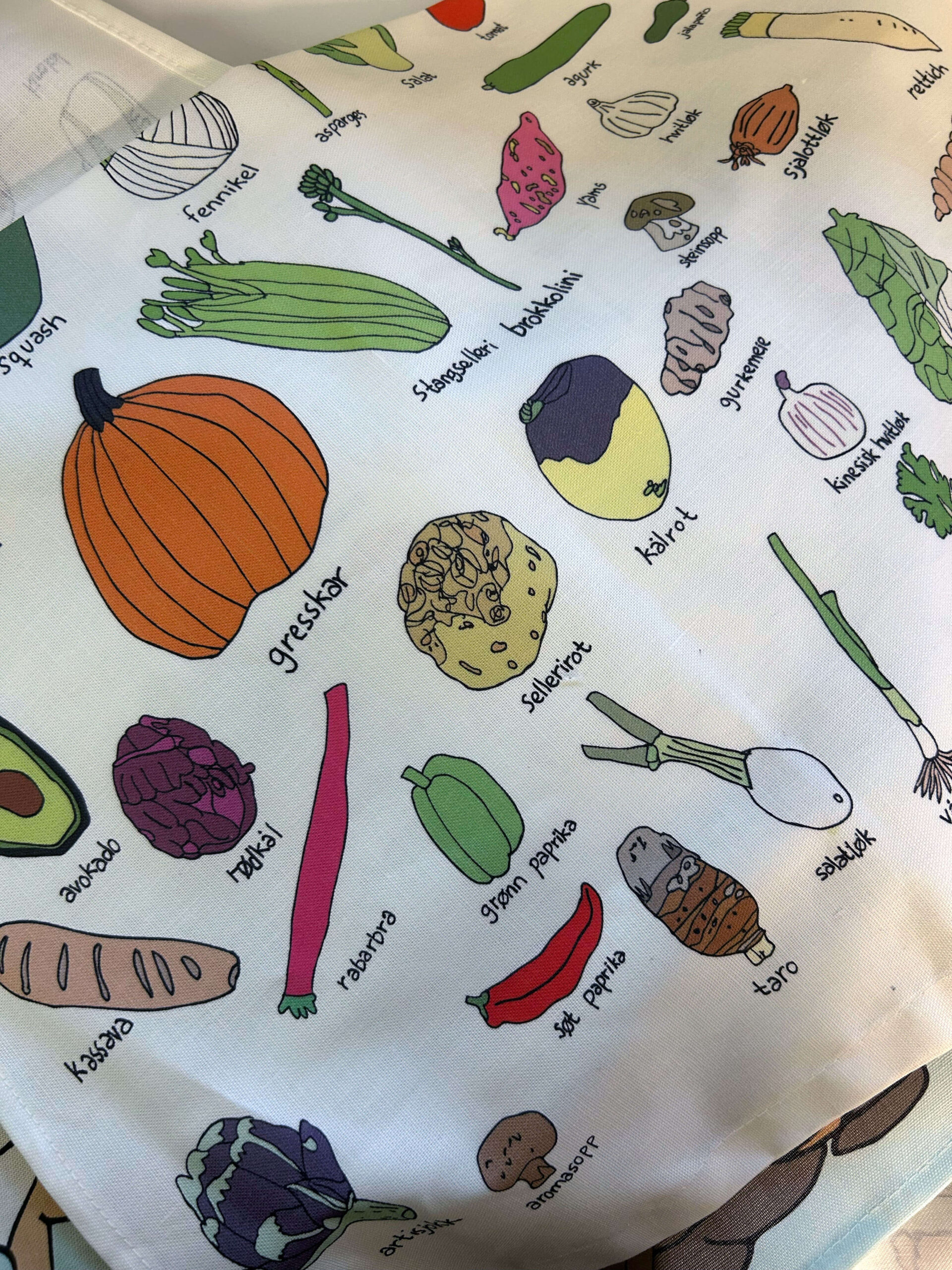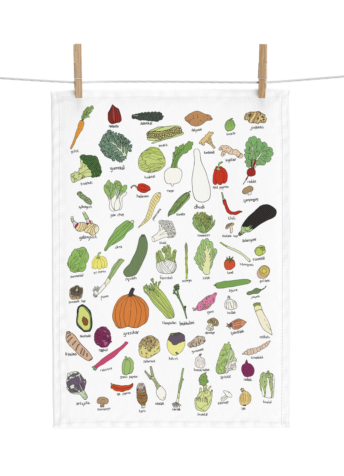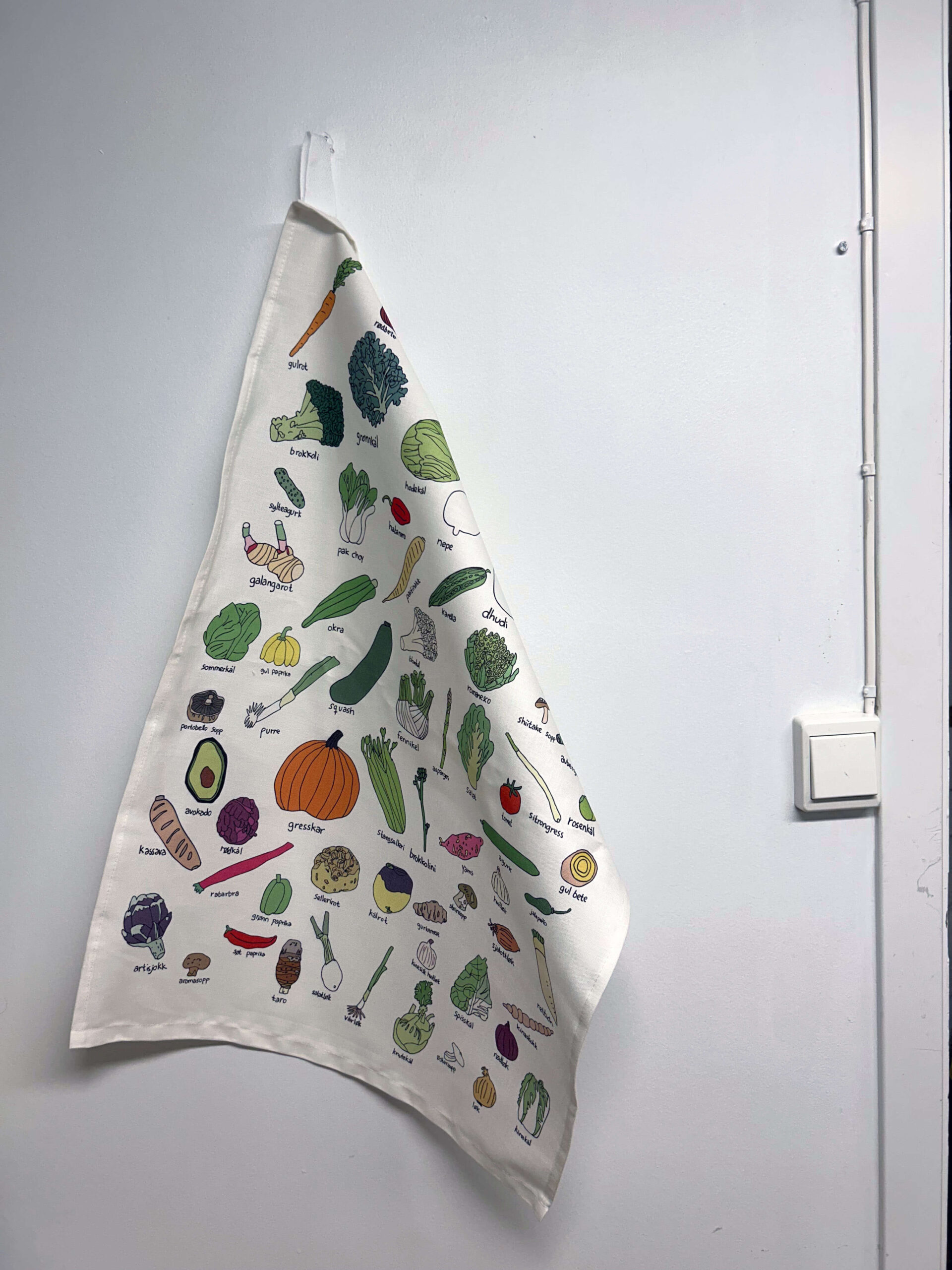 Med fargerike og håndtegnede illustrasjoner av et bredt utvalg grønnsaker, kombinerer dette håndkleet nytte med dekorativt uttrykk.